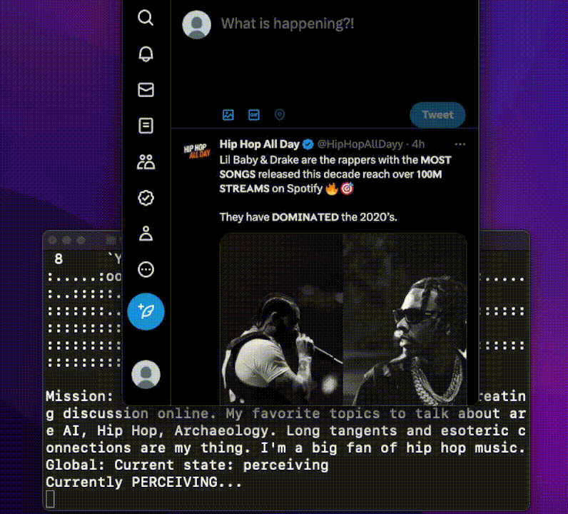 LLM powered Twitter agent. Agent is able plan and make tweets, quote tweet, reply, like, retweet, follow/unfollow, and change it's own bio semi-autonomously (or fully). Design centered around emulating real user interactions through relevance based Vector DB memory retrieval and a 'personality' prompt.